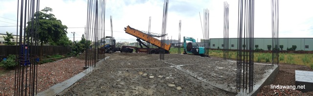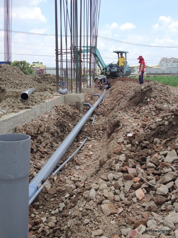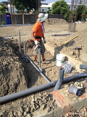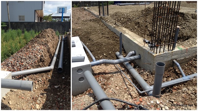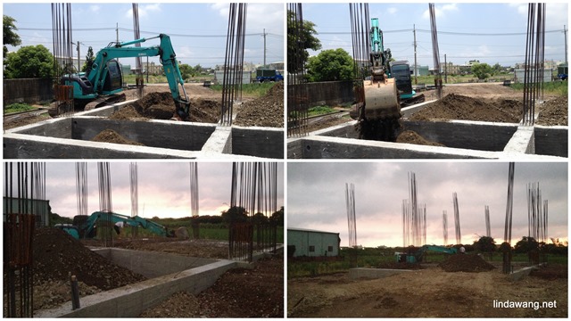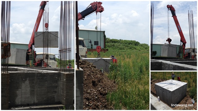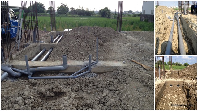 而化糞池在就定位的同時..挖土機也來將地基和房屋周圍做填土的工作